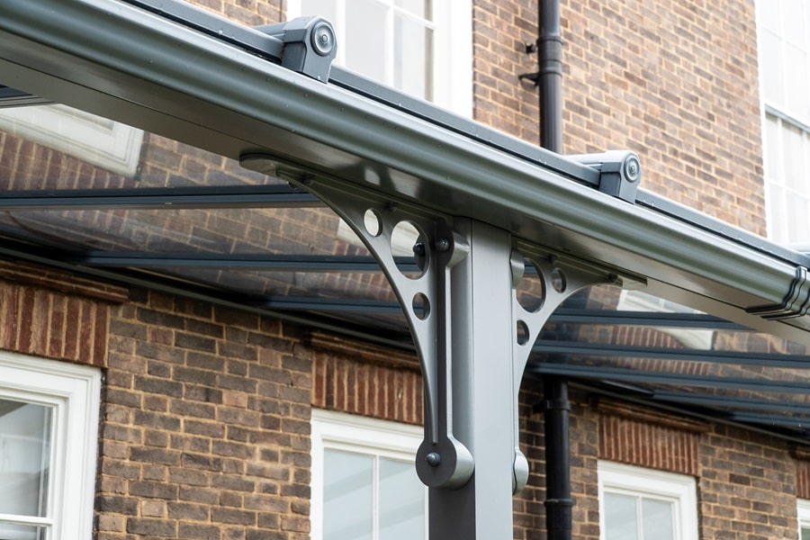Frames are galvanised steel or powder-coated aluminium, both chosen for durability, with UV-resistant polycarbonate or glass roofing. All components are designed for British weather, resistant to corrosion and available in colours to match surrounding buildings. Every canopy is engineered to British Standards with site-specific calculations.