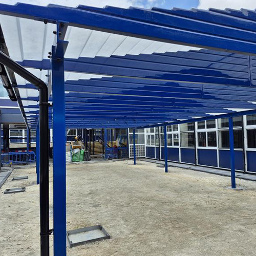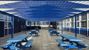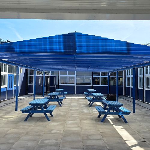 We installed a 15m x 7.5m structure supported by eight posts, creating a large covered area in the courtyard. The freestanding design meant the canopy could sit neatly in the space without needing to attach to the school buildings.
