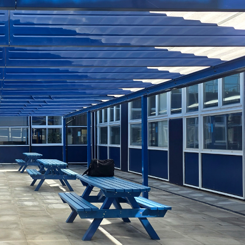 The courtyard has gone from an overgrown, inaccessible space to a practical outdoor dining area that students can use every day. The canopy provides reliable shelter and shade, and the benches underneath can be used in all weathers.