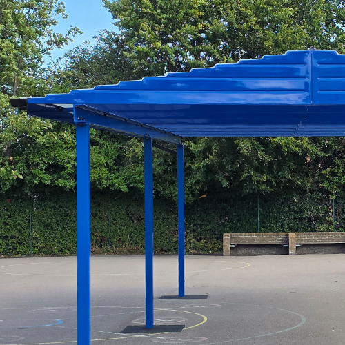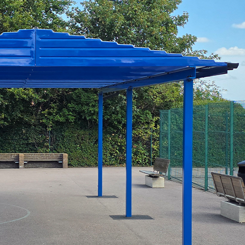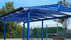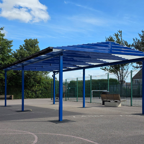 The finished structure measures 10m x 5m and sits on six ground posts and a bright blue finish, giving plenty of covered space in the playground. Because it’s freestanding, the school had flexibility over where to position it for maximum use.