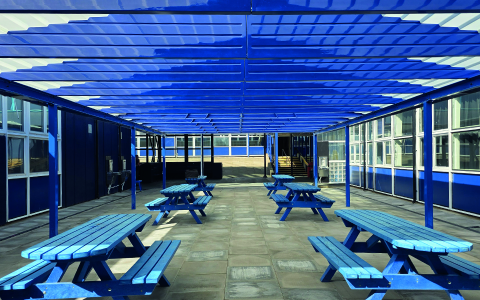 School canopies attach to or stand alongside school buildings to create covered areas that can be used to create valuable additional space. The space offered by a canopy can be used for anything from extra playing space to a dedicated, covered dining area, and more.